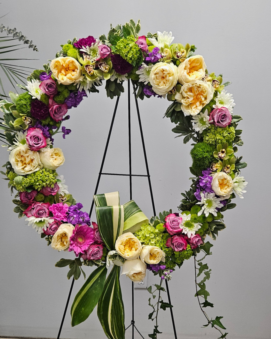 A refined and elegant luxury sympathy wreath designed to honor a beautiful life. This garden-inspired tribute features premium roses, seasonal blooms, orchids, and lush greenery in soft tones of cream, pink, purple, and fresh green. The circular design symbolizes eternity and everlasting love, creating a graceful expression of remembrance and respect.